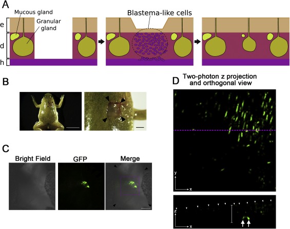 Fig. 4. Skin regeneration and GFP labeling of subcutaneous cells using IR-LEGO in a X. laevis froglet.