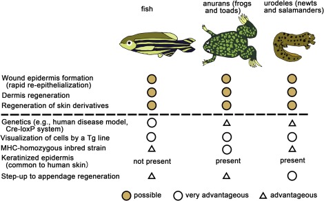 Fig. 6. Summary of the advantages of fish, anurans, and urodeles as models for skin regeneration studies.