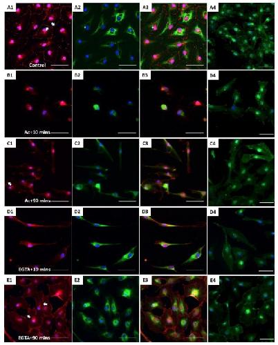 Fig. 4. The effect of CK network on the β-catenin-based cell junctions. XtiSCs were treated with vehicles (Control, A) or 10â mM acrylamide (Ac; B,C) or 2â mM EGTA (EGTA; D,E). After treatment, cells were washed and changed to the fresh medium and then collected at the indicated time points: 10â min (Ac+10 min or EGTA+10 min, B,D) or 90â min (Ac+90 min or EGTA+90 min, C,E) for immunofluorescent staining with antibodies against β-catenin (red, A1âE1), CK (green, A2âE2) and merge (A3âE3). (A4âE4) Fluorescent images of WGA-stained cells showing the cell shape and cytoplasmic membrane. Arrows show membrane β-catenin. Nuclei were stained with DAPI (blue). Scale bars: 50â μm.