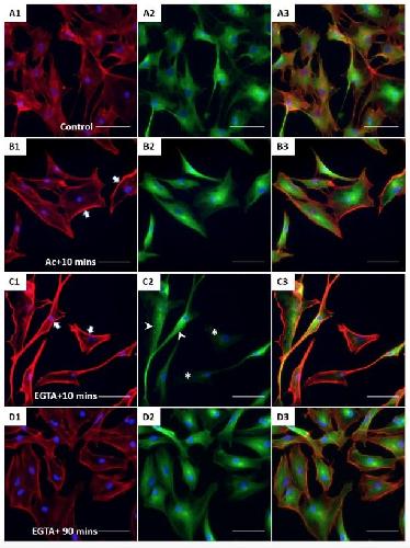 Figure 5. The effect of acrylamide and EGTA on F-actin and tubulin. After treatment, XtiSCs were collected at indicated time points for immunofluorescent staining with antibodies against F-actin (red, A1-D1), β-tubulin (green, A2-D2), and merge (A3-D3). Arrows show thick membrane F-actin in figure B1 and C1. The aggregates of β-tubulin are marked by arrowheads and asterisks indicate the cells without β-tubulin in figure C2. Nuclei were stained with DAPI (blue). Scale bar: 50 μm.