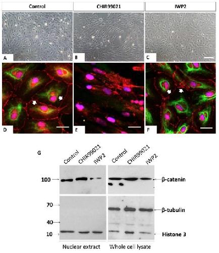 Figure 7. CK regulates plasma membrane β-catenin. (A-B). Phase-contrast images of XtiSCs after treatment with CHIR99021 and IWP2 for 3 days showed the morphological changes in CHIR99021-treated cells. XtiSCs were collected for immunofluorescence (D-F) or immunoblotting analysis (G). Immunostaining of CHIR99021-treated XtiSCs against CK (green) and β-catenin (red) revealed the disruption of cytokeratin network and cell-to-cell contact altogether with the disappearance of membrane β-catenin. Nuclei were stained with DAPI (blue). Scale bar: 20 μm. Arrows indicate membrane-bound β-catenin. The downregulation of nuclear β-catenin in media supplemented with IWP2 was confirmed by immunoblotting result (G). Histone H3 is a marker of nuclei. The absence of β-tubulin shows the purity of the nuclear lysate.
