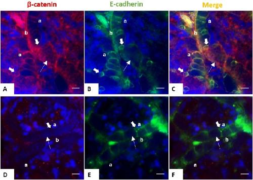development. Double staining on testicular sections of juvenile (5-month old) (A-C) and adult (3-year old) frogs (D-F) with E-cadherin (mouse, green) and β-catenin (rabbit, red) antibodies. Nuclei were stained with DAPI (blue). Scale bar: 20 μm. Both proteins surrounded the Sertoli cells from juvenile testes, but only E-cadherin is expressed in adulthood. Thick arrows indicate Sertoli cells. Thinner arrows show germ cells. Apical â (a) and basal â (b) parts of Sertoli cells are indicated.