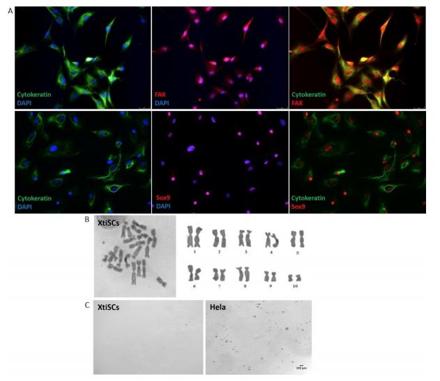 Figure 3. Immunofluorescent, cytogenetic and transformation characteristics of isolated XtiSCs. (A) XtiSCs expressed Sertoli cellsâ proteins including focal adhesion kinase (FAK, red), Sox9 (red) and CK (green), a immature SC marker. Nuclei were stained with DAPI. Chromosome analysis (B) and soft agar assay (C) showed XtiSCs as non-transformed cells.