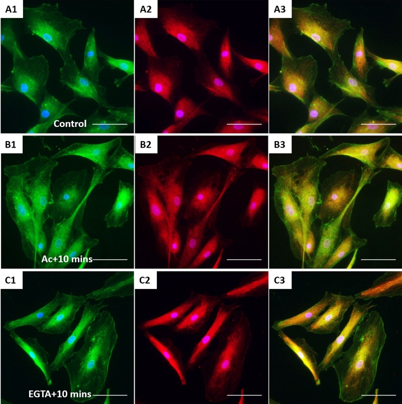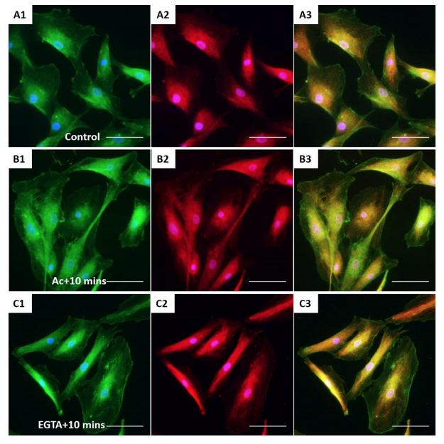 Fig. 6. The effect of acrylamide and EGTA on cell adhesion proteins. Immunofluorescent images of control XtiSCs (A) and XtiSCs 10 min after washing out the acrylamide (B) or EGTA (C) staining with antibodies against integrin β1 (CD29, green, A1–C1), focal adhesion kinase (FAK, red, A2–C2) and merge (A3–C3). Nuclei were stained with DAPI (blue). Scale bars: 50 μm.