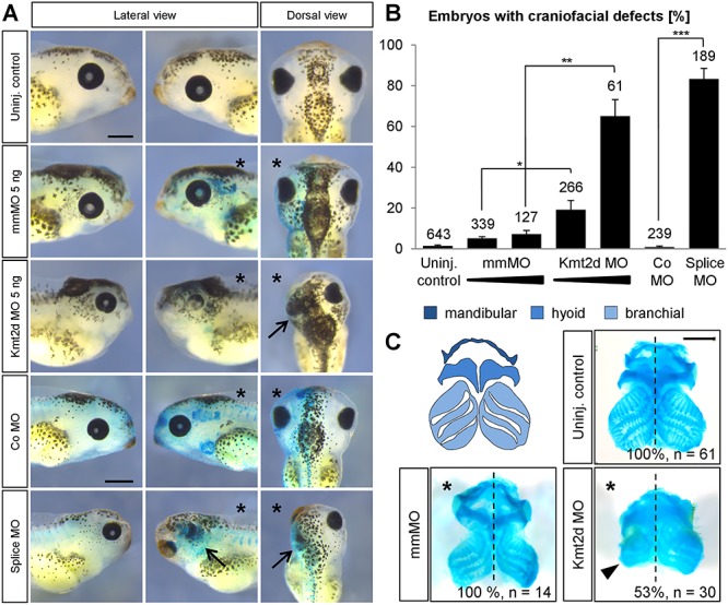 Figure 1. Kmt2d loss-of-function causes craniofacial malformations. (A) Phenotypic analysis of craniofacial defects at stage 42. Embryos were injected with 2.5â5 ng of mmMO or Kmt2d MO or 5 ng control (Co) MO or splice MO into one blastomere at the two-cell stage. 150 pg lacZ mRNA was co-injected as a lineage tracer. The injected side of the embryo is marked (asterisk). Both the Kmt2d MO and the splice MO cause severe craniofacial malformations (arrows), compared to mmMO- and Co MO-treated controls. Scale barsâ=â500 μm. (B) Graph summarizing the results from at least four independent experiments; ±SEM and the number of analyzed embryos are given for each condition. A two-tailed unpaired Studentâs t-test was applied. (C) Cartilage staining. Schematic representation of the cranial cartilage structures of a Xenopus laevis embryo (upper left panel). Embryos were injected with 2.5 ng mmMO or Kmt2d MO in combination with 50 pg mGFP mRNA as a lineage tracer into one blastomere at the two-cell stage, and the cranial cartilage was visualized by Alcian Blue staining at stage 44. Kmt2d knockdown leads to reduced cranial cartilage (arrowhead) on the injected side (asterisk). Scale barâ=â500 μm. |