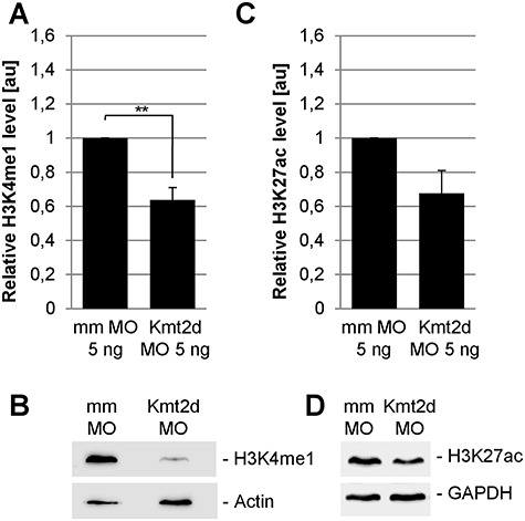 Figure 6. Loss of Kmt2d leads to reduced H3K4me1 and H3K27ac levels in Xenopus embryos. One-cell stage Xenopus embryos were injected with 5 ng mmMO or Kmt2d MO or 7.5 ng control MO or splice MO in combination with 50 pg mGFP mRNA as a lineage tracer. Protein extracts were prepared at neurula stage 20. (A and B) Western Blot analysis of the H3K4me1 mark reveals a reduction of the H3K4me1 level in Kmt2d MO treated embryos compared to controls. Graph summarizes three independent experiments and ±SEM is indicated. A two-tailed unpaired Studentâs t-test was applied. (C and D) H3K27ac Western Blot analysis shows that injection of the Kmt2d MO leads to a decrease in the H3K27ac level, compared to mismatch controls. Graph summarizes the results from four independent experiments and ±SEM is indicated; P-valueâ=â0.0519 in a two-tailed unpaired Studentâs t-test. |