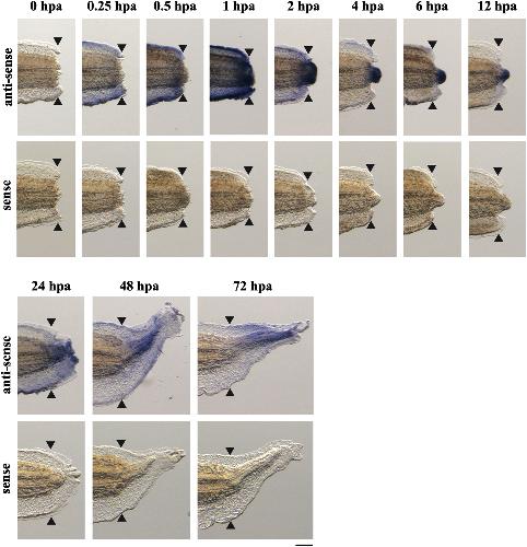 Fig. 1. junb is expressed during tail regeneration of X. tropicalis tadpoles. WISH analysis was performed using regenerating tadpoles at 0, 0.25, 0.5, 1, 2, 4, 6, 12, 24, 48 and 72 hpa. The expression of junb is shown in blue/purple. Black arrowheads indicate the amputation plane. Scale bar: 200â¯Î¼m. (For interpretation of the references to colour in this figure legend, the reader is referred to the Web version of this article.)