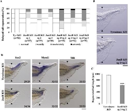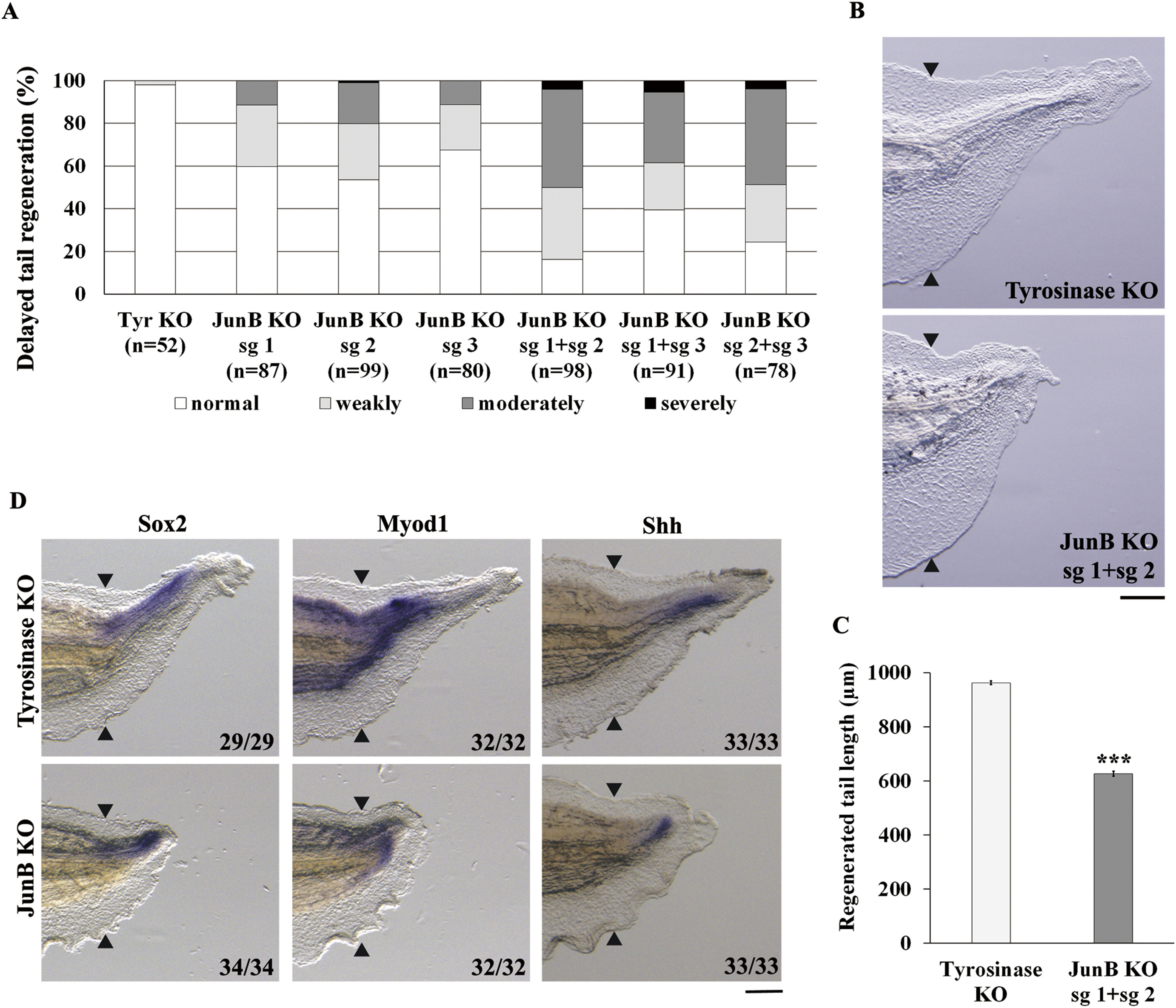 Fig. 2. Knockout of junb prevents tail regeneration. (A) Summary of phenotypes in regenerating tadpoles at 72 hpa. The tadpoles were classified into 4 types: normal tail regeneration; weakly delayed tail regeneration; moderately delayed tail regeneration; and severely delayed tail regeneration. (B) junb KO sg 1 + sg 2 tadpoles show considerably delayed tail regeneration. tyrosinase KO was used as the control. (C) Lengths of regenerating tails. (D) WISH analysis of sox2, myod1 and shh in tyrosinase KO and junb KO tadpoles. Black arrowheads indicate amputation plane. Scale bar: 200 μm. ***P < 0.001, Studentâs t-test.