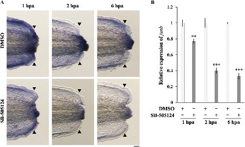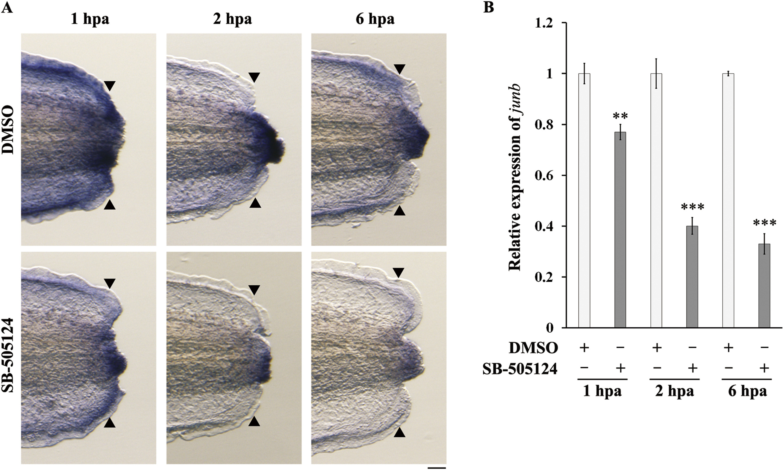 Fig. 4. The expression of junb is downregulated by TGF-β signaling inhibition. Tadpoles were treated with a medium containing 12.5â¯Î¼M SB-505124 or DMSO (Control) from 1â¯h before tail amputation and cultured until 1, 2 and 6 hpa. (A) WISH analysis of junb in SB-treated tadpoles. Nâ¯â¥â¯29 for each sample. (B) qPCR analysis of junb in SB-treated tadpoles. The expression of junb was normalized against rps18 expression, and then against control samples. Scale bar: 50 μm. **P < 0.01, *** <0.001, Studentâs t-test.