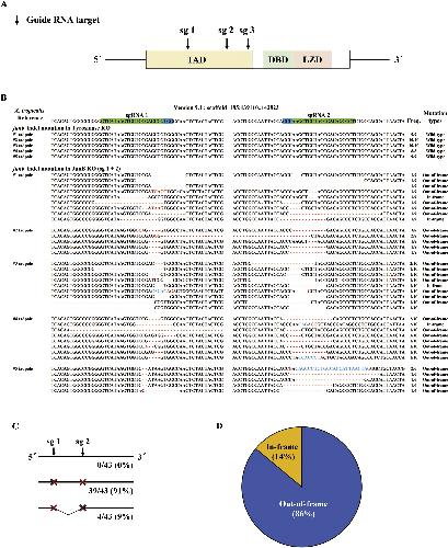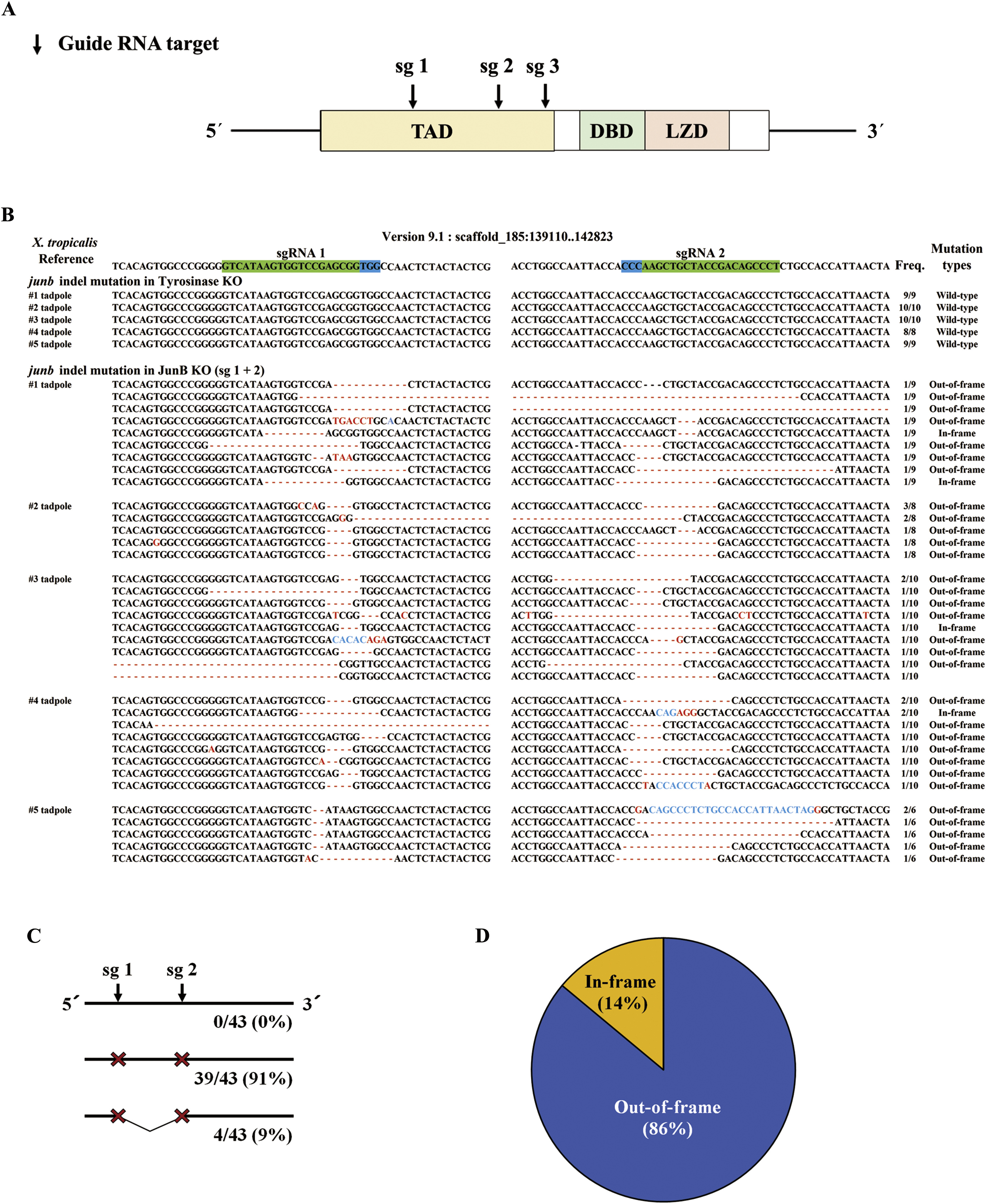 Supplementary Fig. 1. Genotyping of junb KO sg 1 + sg 2 tadpoles. (A) Schematic drawing of junb structure and junb sgRNA target sites. Bars, untranslated region; box, coding region; TAD, transactivation domain; DBD, DNA-binding domain; LZD, leucine zipper domain. (B) Sequencing analysis of junb mutations in tyrosinase KO (n = 5) and junb KO (n = 5) tadpoles. Target sites of sg 1 and sg 2 are highlighted in green, and blue boxes indicate the PAM sequence. Deleted sequences are highlighted with red dashes. Insertions and substitutions are shown in blue and red letters, respectively. Mutation types were categorized as wild-type, in-frame, and out-of-frame. (C) Summary of mutation types as in panel B. Sequencing analysis of TA cloning demonstrates that all of alleles contain mutations in both sg 1 and sg 2 target sites. (D) Percentage of mutation types of junb KO sg 1 + sg 2 as in panel B.