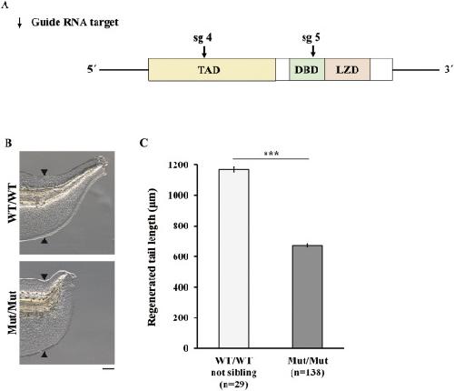 Supplementary Fig. 3. Compound heterozygous junb mutants show a delay in tail regeneration. (A) Schematic drawing of junb structure and junb sgRNA target sites. (B) Compound heterozygous junb mutants (Mut/Mut) show considerable delay in tail regeneration compared to wild-type (WT/WT, not sibling) tadpoles. WT/WT tadpoles were used as the control. (C) Lengths of regenerating tails. Black arrowheads indicate the amputation plane. Scale bar: 200 μm. ***P < 0.001, Student's t-test.