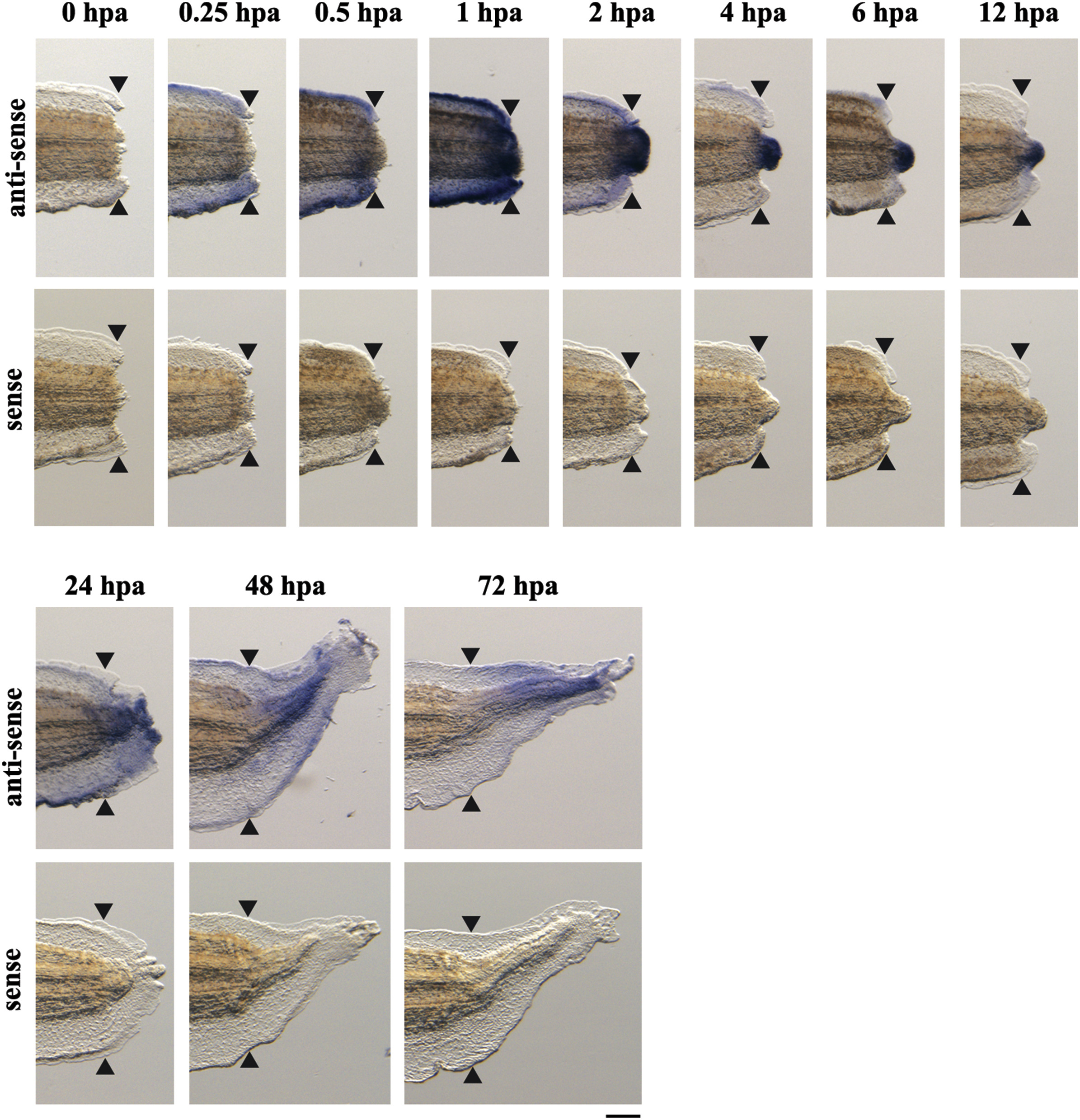Fig. 1. junb is expressed during tail regeneration of X. tropicalis tadpoles. WISH analysis was performed using regenerating tadpoles at 0, 0.25, 0.5, 1, 2, 4, 6, 12, 24, 48 and 72 hpa. The expression of junb is shown in blue/purple. Black arrowheads indicate the amputation plane. Scale bar: 200â¯Î¼m. (For interpretation of the references to colour in this figure legend, the reader is referred to the Web version of this article.)