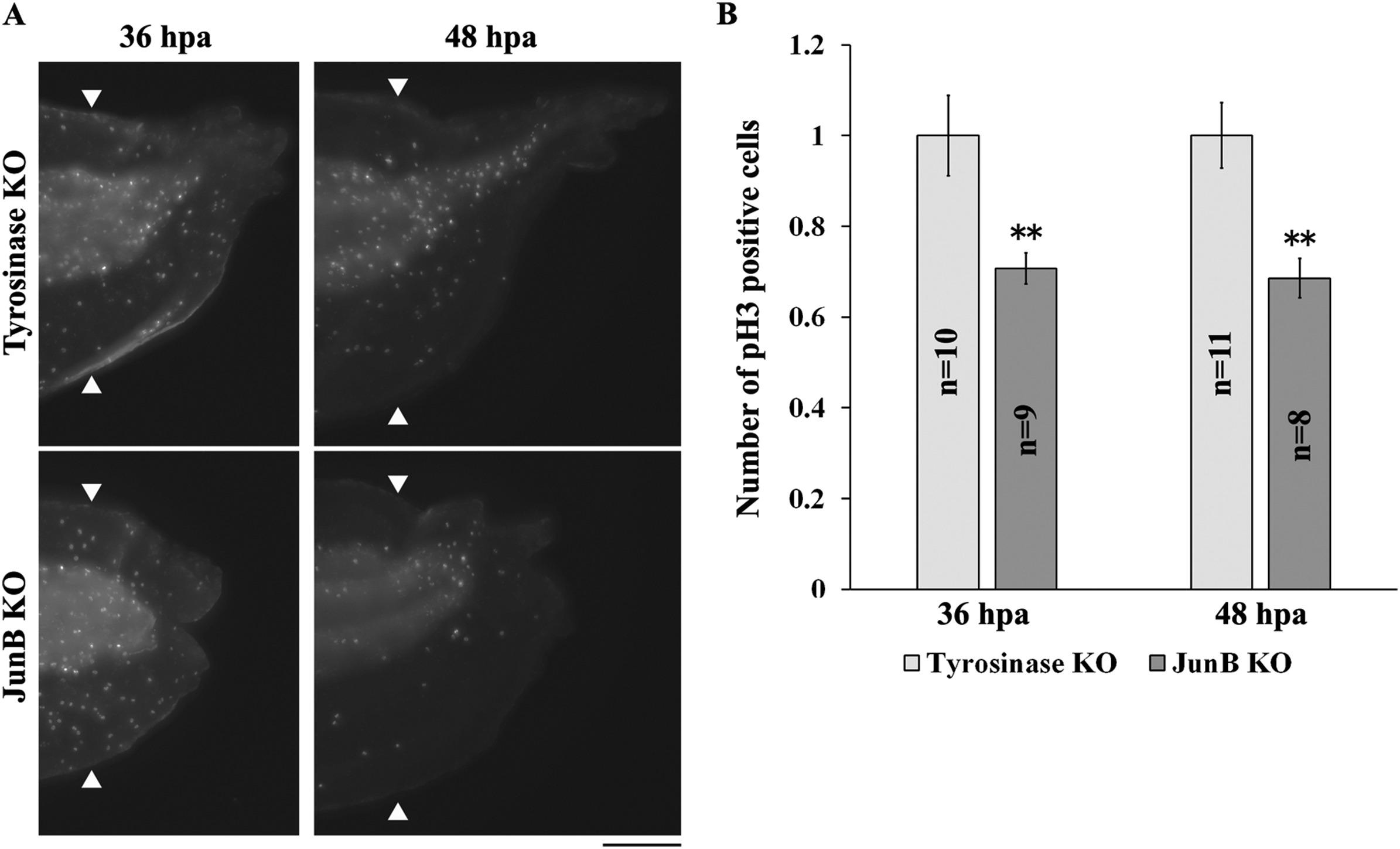 Fig. 3. Knockout of junb reduces cell proliferation. (A) Whole-mount immunostaining of junb KO tadpoles with pH3 antibody at 36 and 48 hpa. (B) Quantification of pH3 positive cells in the region of regenerating tail, excluding the fin. The number of pH3 positive cells was divided by individual area, and normalized against control samples. White arrowheads indicate the amputation plane. Scale bar: 200 μm. **P < 0.01, Studentâs t-test.