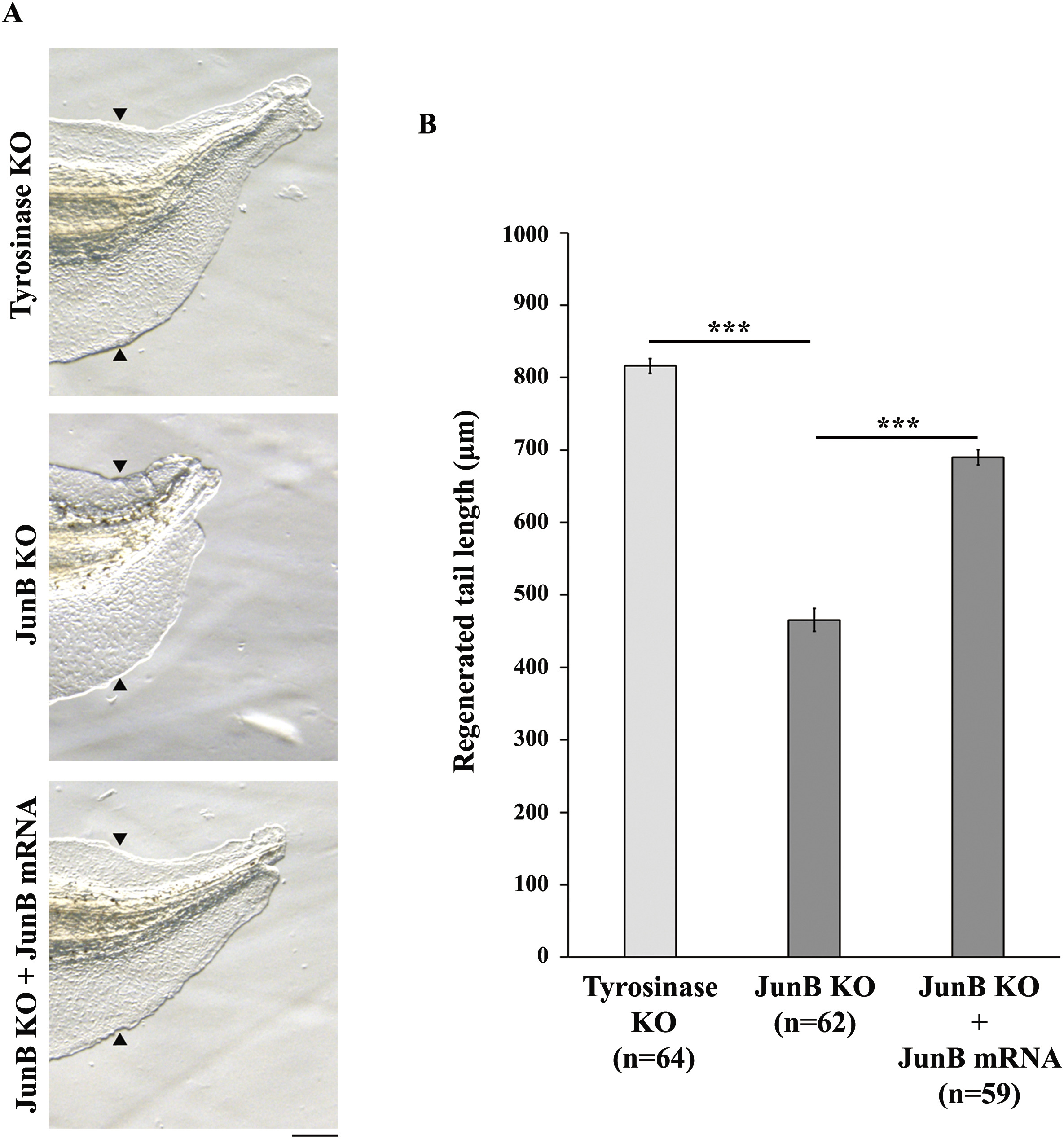 Supplementary Fig. 2. The delay in tail regeneration in junb KO is rescued by junb mRNA. (A) Co-injection of junb mRNA (250 pg) with junb sg 1 + sg 2 rescues the junb KO phenotype. (B) Lengths of regenerating tails. Black arrowheads indicate the amputation plane. Scale bar: 200 μm. ***P < 0.001, Student's t-test.