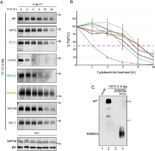 FIGURE 5:. TMTC3 WT and disease variant stability. (A) HEK293T cells were transfected with S-tagged TMTC3 WT or disease variant cDNA as indicated. Cells were treated with 100 μg/ml cycloheximide for the indicated time prior to collection and lysed in MNT, and samples were subjected to affinity purification with S-protein agarose. Reducing sample buffer was added and samples were analyzed via 9% SDSâPAGE and immunoblotted for the S-tag epitope. Cell lysates were also subjected to precipitation with 10% TCA, analyzed via 9% SDSâPAGE, and immunoblotted with KDEL antisera to determine stability of GRP94 and BiP (WCL). (B) Time points were collected at 0, 2, 4, 8, 16, and 24 h after cycloheximide treatment. The amount of TMTC3 protein remaining at 2, 4, 8, 16, and 24 h was quantified and normalized to the starting material (0 h) and averaged from three independent experiments. Error bars represent SEM. (C) HEK293T cells were transfected with S-tagged TMTC3 WT or the TMTC3 R488Efs disease variant as indicated. Cells transfected with the TMTC3 R488Efs variant were treated with 20 μM MG132 for 12 h prior to collection and lysis in MNT (lane 4). Samples were subjected to affinity purification with S-protein agarose and analyzed via SDSâPAGE prior to immunoblotting for the S-tag epitope. |