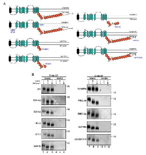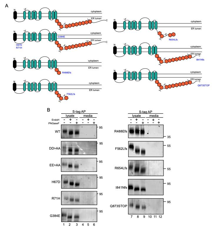 Supplemental Figure 5. TMTC3 disease variant predictive outcomes and carbohydrate analysis. (A) The organization of TMTC3 WT and disease variants signal sequence (black), hydrophobic domains (teal), TPR domains (orange). N-linked glycosylation sites are indicated by small black, branched structures. Mutations are indicated in blue. (B) HEK293T cells were transfected with S-tagged TMTC3 WT and disease variants cDNA as indicated and were affinity purified from the media and the lysed cells using S-protein agarose. Samples were then subjected to a glycosylation assay with either EndoH (lanes 2, 5, 8 and 11) or PNGaseF (lanes 3, 6, 9 and 12) digestion as indicated. Reducing sample buffer was added, and the samples were analyzed by a 6% SDS-PAGE. |