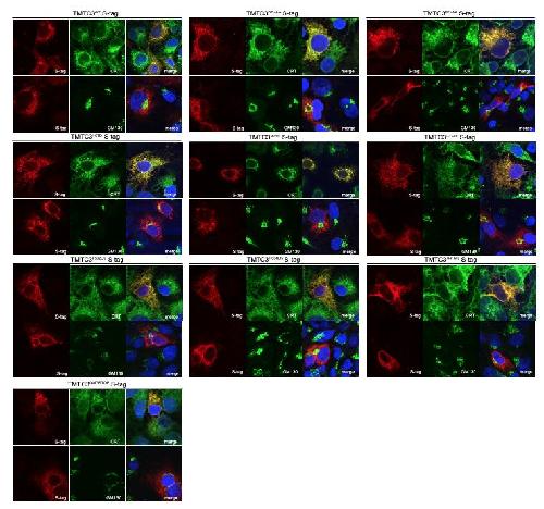 Supplemental Figure 6. Cellular localization of TMTC3 disease variants. Cellular localization of TMTC3 disease variants was investigated by confocal microscopy. Cos7 cells were transfected with TMTC3 disease variant cDNA. Fixed cells were stained with S-tag, ERp57 (ER) or GM130 (Golgi) antisera. Nuclei were visualized by DAPI staining (blue). |