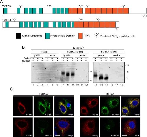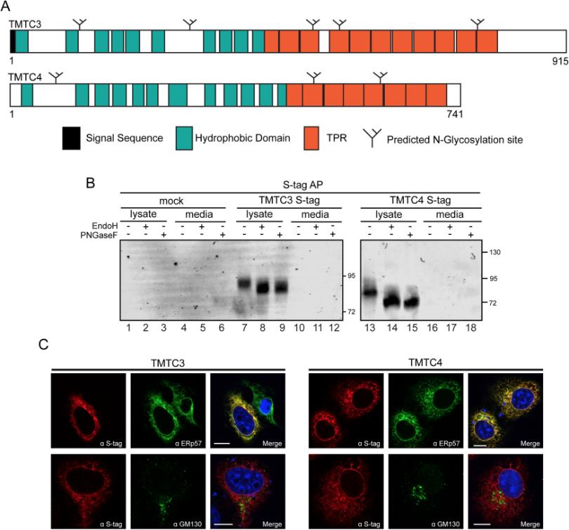 FIGURE 1:. TMTC3 and TMTC4 are ER resident proteins. (A) The organization of TMTC3 and TMTC4 with signal sequences (black), hydrophobic domains (teal), and TPR domains (orange) as designated. The start and end positions of each domain are as follows: TMTC3 hydrophobic domains (amino acids 9â30, 94â115, 140â161, 169â187, 192â214, 235â257, 321â340, 347â367, 371â393, and 402â422), TMTC3 TPR motifs (amino acids 412â445, 446â479, 480â513, 529â562, 563â596, 597â630, 632â665, 669â702, 703â736, 738â771, and 772â805), TMTC4 hydrophobic domains (amino acids 20â38, 109â130, 142â161, 170â192, 203â221, 225â245, 269â291, 320â339, 353â374, 381â403, 412â433, and 440â460), and TMTC4 TPR motifs (amino acids 448â481, 482â515, 516â549, 550â583, 584â617, 618â651, 652â685, and 686â719). Predicted endogenous N-linked glycosylation sites are indicated by small black, branched structures. (B) HEK293T cells were transfected with S-tagged TMTC3 or TMTC4 as indicated and were affinity purified from the cell lysate and media using S-protein agarose. Samples were then subjected to a glycosylation assay with either EndoH (lanes 2, 5, 8, 11, 14, and 17) or PNGaseF (lanes 3, 6, 9, 12, 15, and 18) digestion as indicated. Reducing sample buffer was added and the samples were analyzed by a 6% (TMTC3 S-tag) and 8% (TMTC4 S-tag) SDSâPAGE. (C) Cellular localization of TMTC3 and TMTC4 was investigated by confocal microscopy. COS7 cells were transfected with TMTC3 or TMTC4 cDNA. Fixed cells were stained with S-tag, ERp57 (ER) or GM130 (Golgi) antisera. Nuclei were visualized by 4â²,6-diamidino-2-phenylindole staining (blue). Scale bars correspond to 10 µm. |