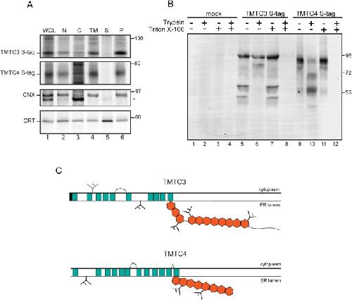 FIGURE 2:. TMTC3 and TMTC4 are transmembrane proteins with their TPR domains facing the ER lumen. (A) HEK293T cells were transfected with S-tagged TMTC3 or TMTC4 as indicated and radiolabeled for 1 h with [35S]-Cys/Met. Cells were homogenized and fractionated prior to alkaline extraction. The fractions collected were whole cell lysate (WCL), nucleus (N), cytosol (C), total membrane (TM), as well as supernatant (S), and pellet (P) fractions on alkaline extraction of the TM. All samples were subjected to affinity purification with S-tag agarose or calnexin (CNX) and CRT immunoprecipitation where indicated. Samples were analyzed via SDSâPAGE and detected via autoradiography. (B) TMTC3 S-tag and TMTC4 S-tag were expressed in HEK293T cells. Cells were homogenized and microsomes were isolated by ultracentrifugation then resuspended in homogenization buffer. Aliquots of the ER microsomes were incubated for 15 min at 27°C with or without Triton X-100 and trypsin where indicated. Samples were separated on 9% SDSâPAGE and immunoblotted for the S-tag epitope. (C) Putative trypsin protease cleavage areas (dashed line) on TMTC3 and TMTC4 based on exposed potential cleavage residues and size of cleaved bands in B. Orange hexagons represent ER lumenâfacing TPR motifs. |