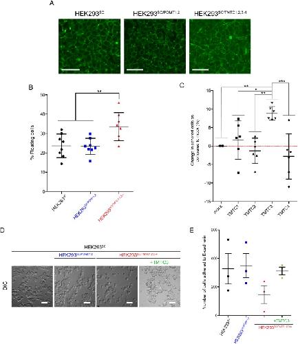 FIGURE 4: TMTC3 enhances E-cadherinâmediated cellular adherence. (A) Cellular localization of cadherins was investigated by confocal microscopy. HEK293SC, HEK293SC/POMT1,2, and HEK293SC/TMTC1,2,3,4 cells were fixed and stained with pan-cadherin antisera. Scale bars correspond to 50 µm. (B) Adherence was assessed in previously described cell lines. Cells were resuspended in growth media, and 1 à 106 cells were subsequently plated in a 24-well plate. Cells were allowed to adhere for 30 min. Unadhered cells were collected and adhered cells were trypsinized and collected. The data describe the percentage of floating (unadhered) cells over the total (unadhered + adhered) after counting both fractions. Statistical significance between cell types was calculated using one-way ANOVA. Measurements designated ** have a P value of <0.01. Error bars represent the SD. (C) TMTC1, -2, -3, or -4 cDNA was transfected into HEK293SC/TMTC1,2,3,4 cells and adherence was assessed as described in B. The increase or decrease of adherence of cells transfected with TMTC1, -2, -3, or -4 was established by subtracting the percentage of mock transfected adhered cells (red dashed line) from the percentage of adhered, transfected cells (adhered/[unadhered + adhered]). Error bars represent the SD. Statistical significance between cell treatments was calculated using one-way ANOVA. Measurements designated *, **, or *** have a P value of <0.05, <0.01 or <0.001, respectively. (D) Cellular adherence to immobilized E-cadherin was assessed via immunoassay. HEK293SC, HEK293SC/POMT1,2, and HEK293SC/TMTC1,2,3,4 cells and HEK293SC/TMTC1,2,3,4 cells transfected with TMTC3 were resuspended and 60,000 cells were placed on immobilized E-cadherin (50 µg/ml). Cells were allowed to attach for 1 h prior to fixing with PFA, permeabilization with Triton X-100, and staining with Hoescht. Hoescht nuclear staining and DIC images (pictured) were acquired at 40à magnification. Scale bars correspond to 50 µm. (E) The number of cells adhered to E-cadherin in previously described cell lines was estimated by averaging five randomized images capturing nuclei intensity at 405 nm within each well from three independent experiments. Error bars represent the SD. |
