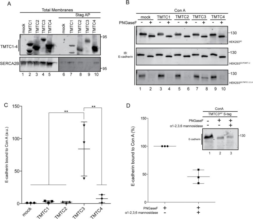FIGURE 3: TMTC3 rescues O-mannosylation of E-cadherin in HEK293SC/TMTC1,2,3,4 cells. (A) HEK293T cells expressing TMTC1, -2, -3, or -4 were harvested in isotonic buffer and homogenized. A portion of the cell homogenate was subjected to ultracentrifugation and resuspended in reducing sample buffer. This was considered the total membrane fraction (lanes 1â5). An excess of MNT lysis buffer was added to an equal amount of cell homogenate and subjected to S-protein agarose affinity purification (lanes 6â10). Proteins were detected by immunoblotting with appropriate antisera directed against the S-tag epitope and SERCA2B. (B) S-tagged TMTC1, -2, -3, or -4 cDNA was transfected into indicated cell lines. Cell lysates were collected and split, one half subjected to treatment with endoglycosidase PNGaseF (lanes 2, 4, 6, 8, and 10), prior to pulling down glycosylated proteins with Con A. Samples were then analyzed by 6% SDSâPAGE and immunoblotted with E-cadherin antisera to assess levels of glycosylated E-cadherin. (C) Quantification of relative density of O-glycosylated E-cadherin from HEK293SC/TMTC1,2,3,4 cells transfected with TMTC1, -2, -3, and -4 cDNA, respectively. Statistical significance between nontransfected cells and TMTC1, -2, -3, or -4 transfected cells was calculated using one-way ANOVA. Measurements designated ** have a P value of <0.01. Error bars represent SD. (D) HEK293SC/TMTC1,2,3,4 cells were transfected with S-tagged TMTC3 cDNA. Cell lysates were collected and subjected to a glycosylation assay with either PNGaseF (lane 2) or combined PNGaseF and α1-2,3,6 mannosidase treatment (lane 3) prior to affinity purification of glycosylated proteins by Con A. Samples were then analyzed via 9% SDSâPAGE and immunoblotted with E-cadherin antisera. Error bars represent SD. |