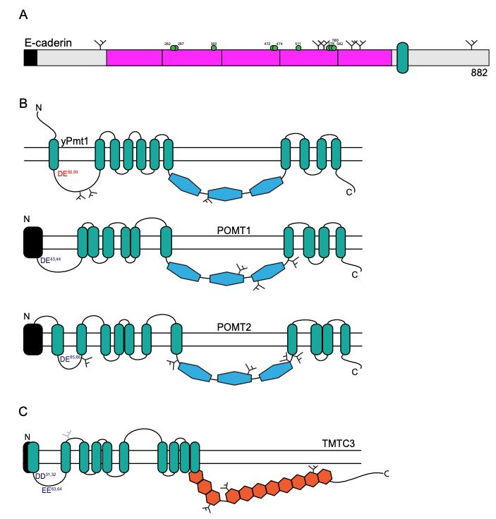 Supplemental Figure 1. TMTCs and POMTs share similar functional domain architecture. (A) The organization of E-cadherin with signal sequence (black), extracellular cadherin domains (pink) and transmembrane domain (teal) as designated. N-linked glycosylation sites are indicated by small black, branched structures and O-mannosylation sites by green circles. (B) The organization of yeast Pmt1 and predicted organization of human POMT1 and 2 with signal sequences (black), hydrophobic domains (teal) and MIR domains (blue) as designated. Predicted endogenous N-linked glycosylation sites are indicated by small black, branched structures and putative diacidic motif active sites are indicated in dark blue (red for active site that has been identified in yPmts).(C) Predicted organization of human TMTC3 with signal sequence (black), hydrophobic domains (teal), TPR domains (orange) and predicted active sites (diacidic DE and EE residues in dark blue) as designated. |