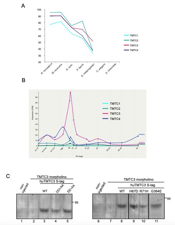 Supplemental Figure 7. TMTC conservation in commonly studied species and RNA expression in Xenopus laevis. (A) Sequence identity (%) of the TMTC proteins in commonly studied species was assessed by comparing amino acid sequences of each species listed to the human sequence. (B) RNA expression of Tmtc1-4 during Xenopus laevis development up to stage 40. These expression profiles were based on data collected in the study by Session et. al in Nature 2016. (C) Embryos were injected with Tmtc3 morpholino at the one cell stage approximately 45 min after fertilization. Selected embryos were subsequently injected with human TMTC3 RNA (lanes 3, 4, 5, 8, 9, 10 and 11). Non-injected and indicated injected embryos were collected at stage 12 and resuspended in Modified Barth’s Saline (MBS) buffer with 1% triton X-100. Total protein was precipitated with 10% trichloroacidic acid, resuspended in reducing sample buffer, analyzed by a 9% SDS-PAGE and immunobloted for the S-tag epitope. |
