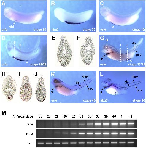 Fig. 4. ERFE is expressed in the ventral blood islands and in circulating primitive blood cells. A-L. The spatio-temporal expression of erfe was determined by whole-mount in situ hybridization and compared to that of hba3. Embryonic stages and probes used are indicated in the lower left corner. A. Erfe transcripts are first detected at stage 30 within the anterior domain of the ventral blood islands (vbi). B. At the same stage, hba3 expression extends to the posterior end of the vbi. C-D. erfe expression in the vbi (white arrowhead) expands posteriorly, overlapping with the vbi. E-F. Transverse sections of a stage 35/36 embryo stained for erfe expression. Dashed lines in panel D indicate the levels of sections. G. At stage 37/38, erfe expressing cells are no longer exclusive to the vbi (white arrowhead) but they are also found within the heart and the dorsal blood vessels. H-J. Transverse sections of a stage 37/38 embryo as shown in panel G. Dashed lines (G) indicate the levels of sections. K-L. erfe and hba3 exhibit overlapping territories of expression within the heart and the main blood vessels. da - dorsal aorta; dlav - dorsal longitudinal anastomotic vessel; h â heart; pcv - posterior cardinal vein; vbi â ventral blood islands. M. The onset of hba3 expression precedes the induction of zygotic erfe expression. Total RNA was harvested from staged embryos and analyzed by RT-PCR. |