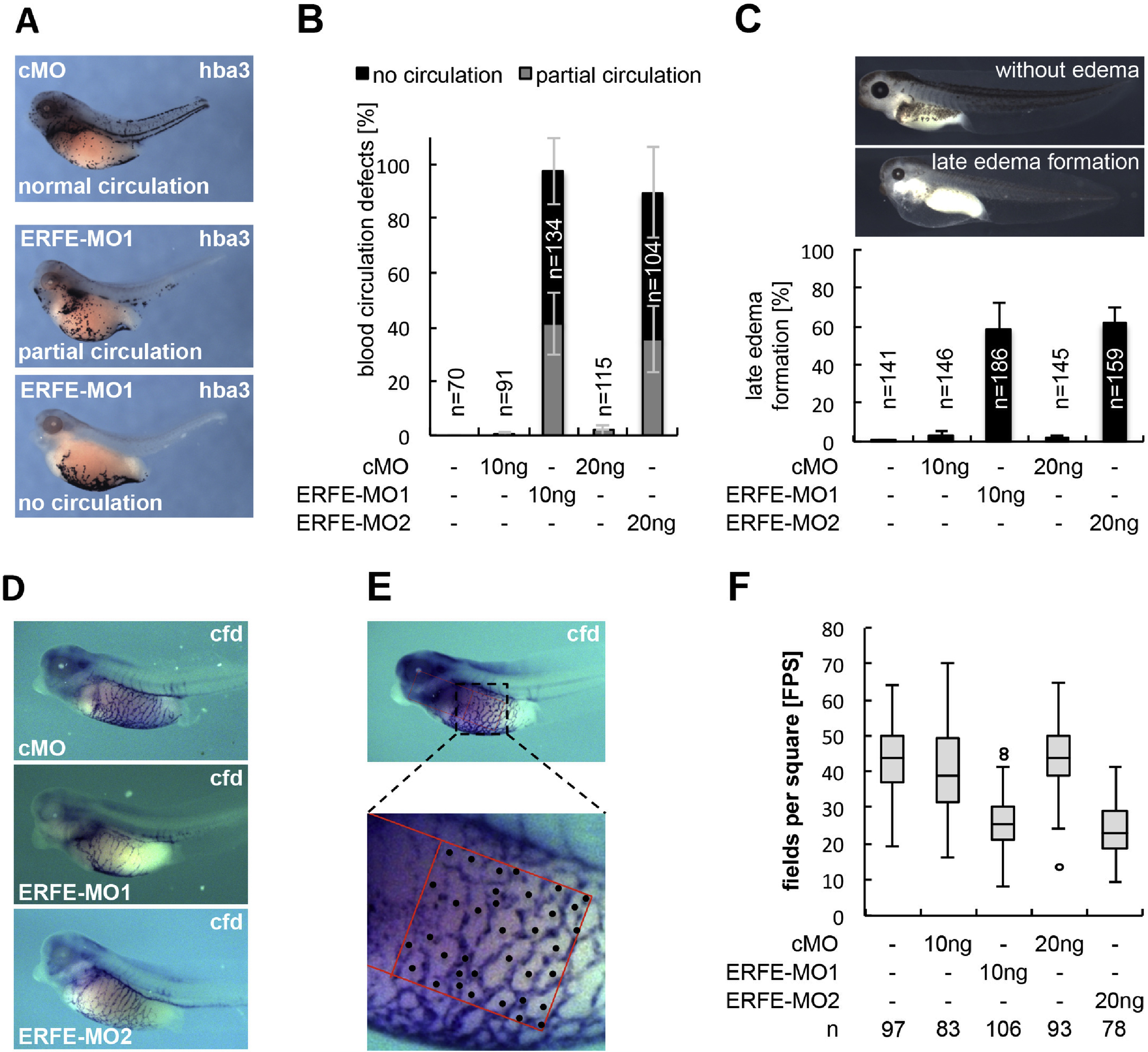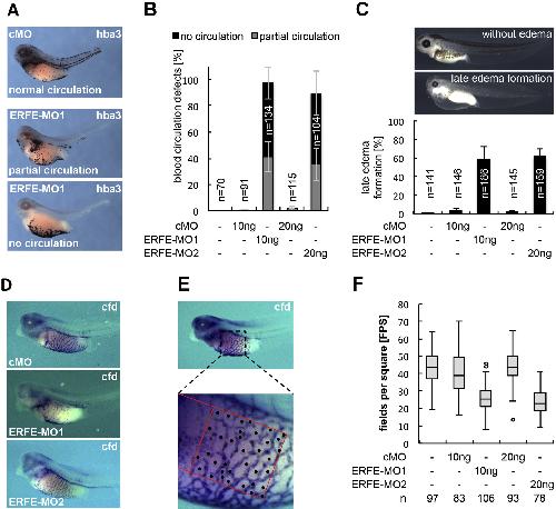 Fig. 5. Erfe knockdown results in defects of vascular network formation and, in consequence, late edema formation as well as impaired embryonic blood circulation. A-F. Embryos were injected marginally with ERFE-MOs or a standard control morpholino (cMO) into all four vegetal blastomeres at the eight-cell stage and cultivated until stage 41 (A,B,D-F) or stage 42 (C). C. Amounts of injected MOs are indicated. A-B. Primitive blood circulation is affected upon ERFE loss-of-function (LOF). Hba3 expression was determined by WMISH. A. Representative embryos showing three different circulation phenotypes, as indicated. B. Quantification of circulation defects observed upon MO-injection. The graph summarizes three independent experiments. Numbers of injected embryos and s.e.m. are indicated. C. Erfe knockdown leads to edema formation at tadpole stage. Quantification of ERFE-MO-injected embryos forming late edema, shown by representative embryos, as indicated. The graphs summarize three independent experiments. Numbers of injected embryos, and s.e.m. are indicated. D-F. Erfe LOF results in reduced ramification of the vitelline vein network (vvn). Cfd expression was examined by WMISH. D. Representative embryos showing a reduced complexity of the vvn upon ERFE-MO injection as compared to cMO injection. E. Scheme representing the strategy to quantify vvn complexity. Within a defined area, the number of fields separated from each other by blood vessels was determined (fields per square, FPS). F. Quantification of vvn complexity. Boxplots display the range of FPS values observed in embryos from three independent biological replicates. The upper whisker is set at 1.5 x interquartile range above the third quartile, the lower whisker is set at 1.5 x interquartile range below the first quartile. Outliers are indicated (°). |