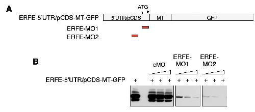 Fig. S5. ERFE morpholino oligonucleotides efficiently block ERFE reporter protein synthesis. A-B. Two independent morpholino oligonucleotides (MO) were designed to block translation of ERFE transcripts. MO activity was tested by co-injection of a GFP reporter construct together with ERFE-MOs and subsequent analysis of reporter protein synthesis. A. The ERFE reporter construct contains part of the erfe 5'UTR (150 bp) and coding sequence (pCDS, 27 bp) including morpholino binding sites fused to the myc-epitope tag (MT) and GFP. B. Both ERFE-MOs block translation of the reporter construct in a dose- dependent manner. 200 pg erfe-5'UTR/pCDS-MT-GFP mRNA was coinjected with 5 ng, 10 ng, or 20 ng erfe-MOs or standard control morpholino (cMO), as indicated. Embryos were injected animally into both blastomeres at the two-cell stage. Lysates from stage 11 embryos were analyzed by Western Blot using anti-MT antibody. |