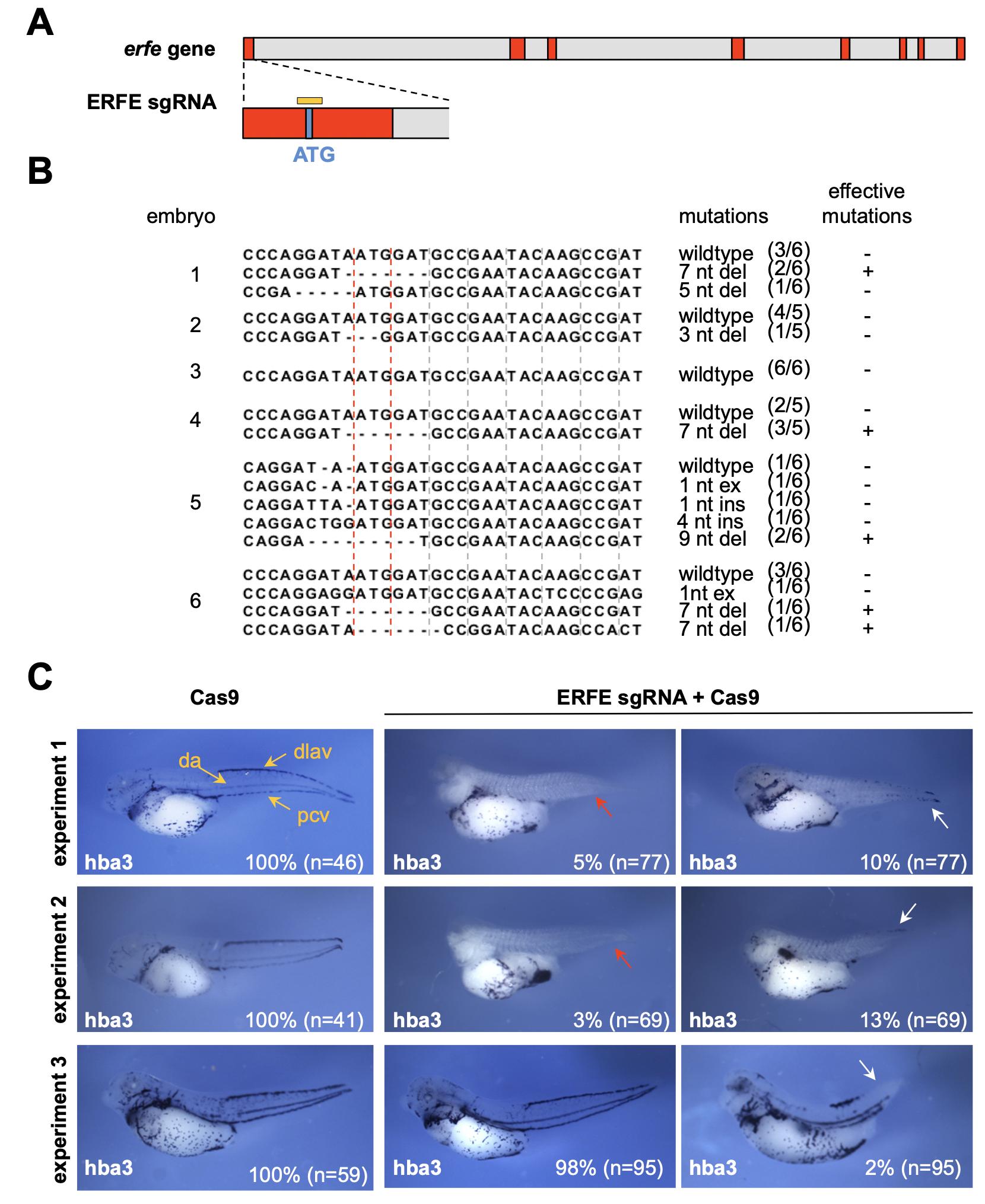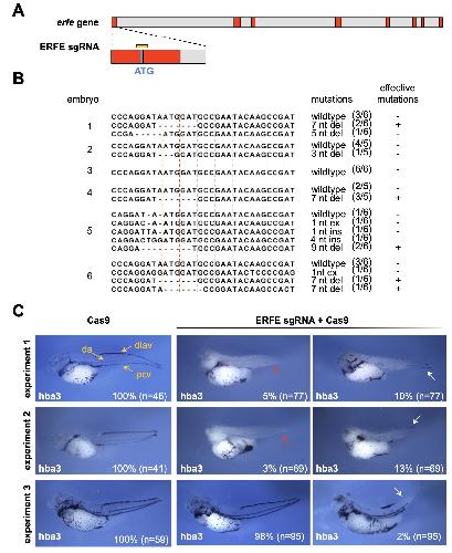 Fig. S7. CRISPR-mediated erfe modification causes moderate circulation defects. A. Schematic representation of the ERFE sgRNA (yellow box) target site covering the translational start site (ATG) of the erfe gene. Exons are colored in red, introns in grey. B. Mutation analysis for the genomic locus of erfe exon1 in ERFE sgRNA/Cas9-injected embryos. Individual embryos, kinds and frequencies of mutations are indicated. Those mutations that, most likely, result in erfe gene disruption are labeled as effective mutations. del: deletion; ex: exchange; ins: insertion; nt: nucleotide. C. Spatial analysis of primitive blood cells upon CRISPR-mediated erfe modification. ERFE sgRNA/Cas9-injected embryos were cultivated until stage 41 and hba3 expression was determined by WMISH. Representative embryos from three independent experiments, as indicated, showing three different circulation phenotypes: normal distribution of RBCs within the dorsal vessels, as indicated in the upper left panel (yellow), reduced number of RBCs within the dorsal vessels (white arrow), and absence of RBCs from the dorsal vessels (red arrow). The penetrance of the phenotype (% of all embryos) and numbers of embryos analyzed (n) are indicated. da: dorsal aorta; dlav: dorsal longitudinal anastomotic vessel; pcv: posterior cardinal vein. |
