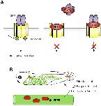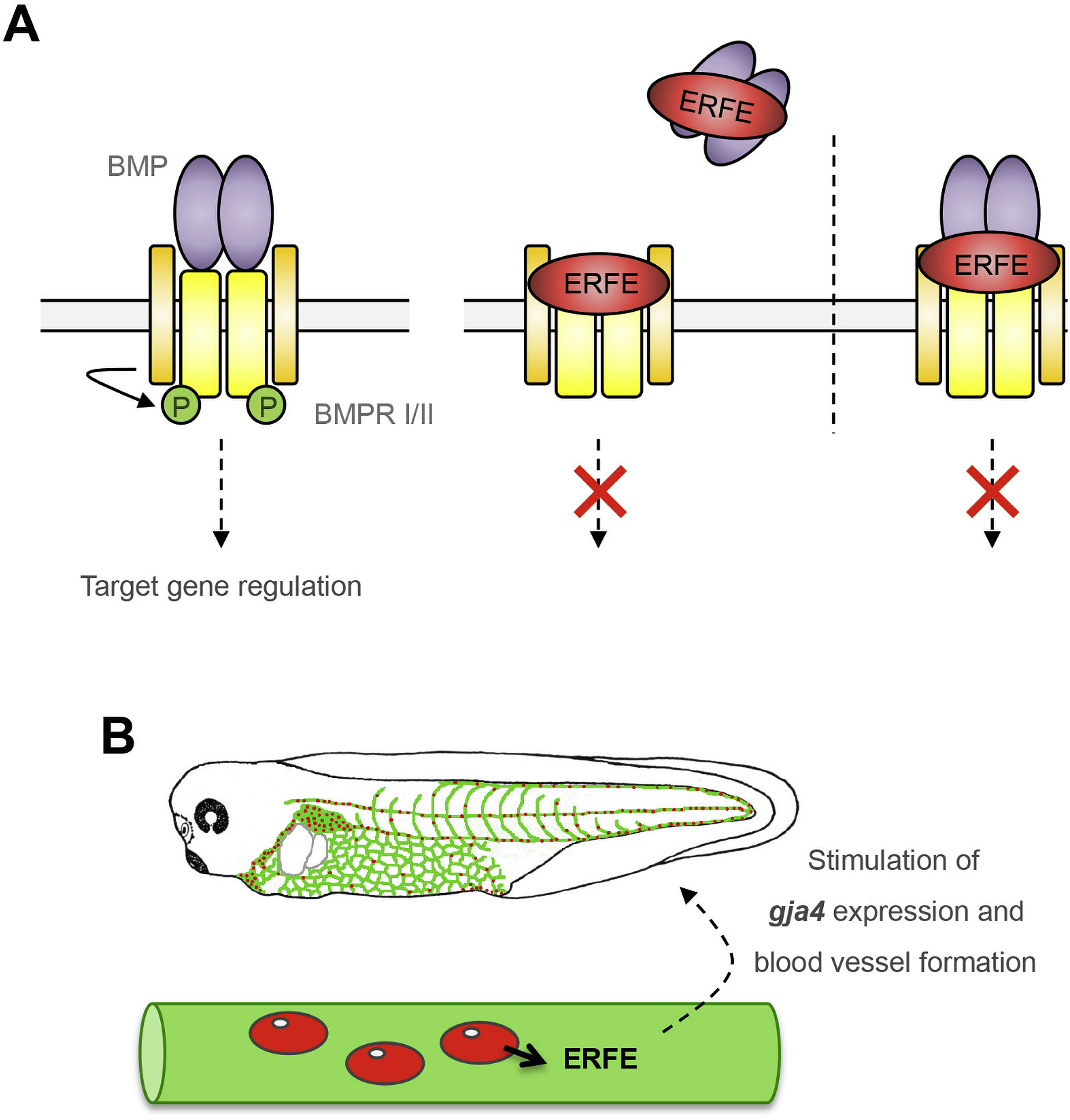 Fig. 7. Schematic reflection of ERFE as a secreted BMP antagonist and positive regulator of vascular development. A. In the absence of extracellular BMP antagonists, a BMP dimer (purple) forms a hetero-hexameric complex with BMP type I (yellow) and type II receptors (orange) leading to autophosphorylation of the type I receptor. ERFE is a secreted BMP antagonist that can interact with both the BMP ligand and, most likely, the BMP type I receptor, suggesting different modes of action for ERFE-mediated BMP antagonism. ERFE could bind and inactivate the complex of BMP proteins and BMP receptors. Alternatively, ERFE could bind the BMP ligand or BMP-receptors and prevent ligand/receptor interaction. B. During development, primitive erythrocytes produce ERFE protein that promotes the formation of a functional vasculature, potentially by stimulating the expression of the vascular gap junction component Gja4. |