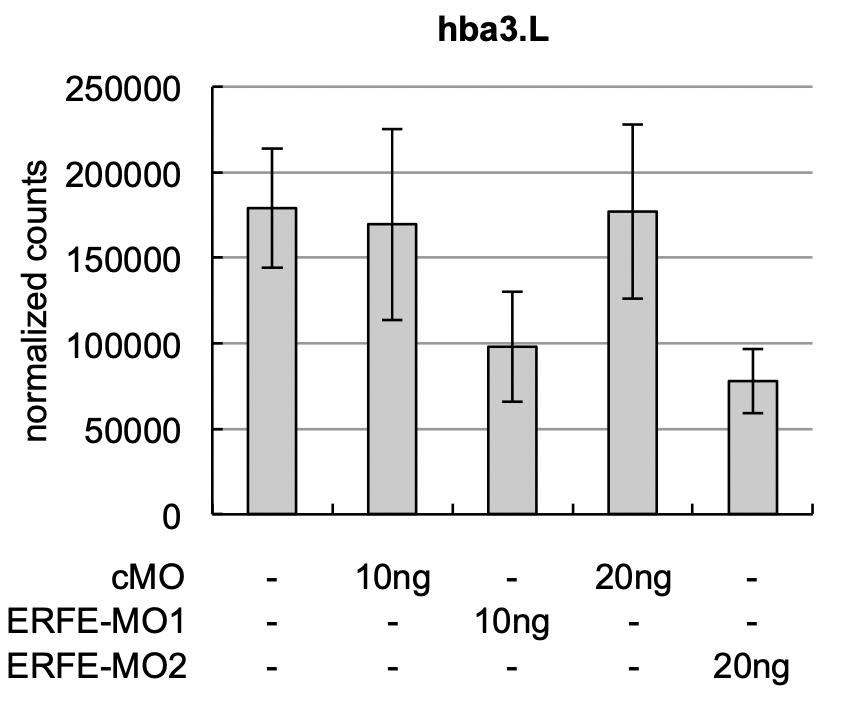 Fig. S6. Expression of embryonic globin subunit hba3 is moderatly reduced upon erfe knockdown. ERFE-MOs or a standard control morpholino (cMO) were injected marginally into all four vegetal blastomeres of eight-cell stage embryos. Amounts of injected MOs are indicated. Total RNA of 5 stage 41 embryos each was extracted and expression levels of hba3 was determined by Nanostring nCounter analysis. The graphs show the averaged normalized counts from 3 independent experiments, and s.e.m. are indicated for each column. |