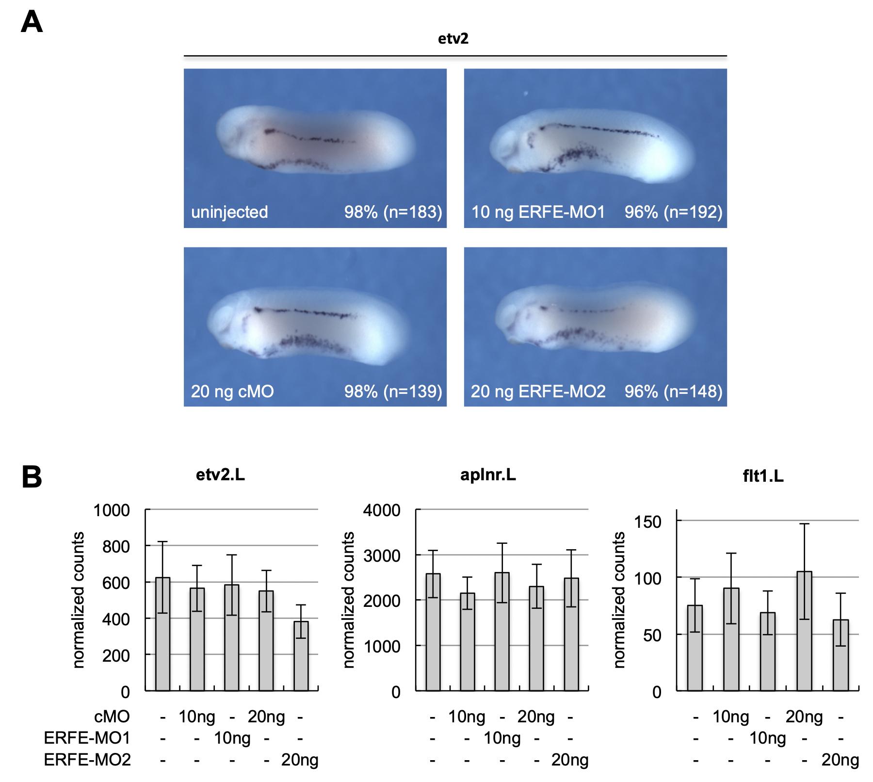 Fig. S8. Specification of vascular cells is not affected upon erfe knockdown. A-B. Expression of vascular specification markers is not significantly changed in ERFE morphant embryos. Embryos were injected with ERFE-MOs or a standard control morpholino (cMO) marginally into all four vegetal blastomeres at the eight-cell stage and cultivated until stage 26. Amounts of injected MOs are indicated. A. etv2 expression was determined by WMISH. Representative embryos showing etv2 expression in endothelial precursor cells. Percentages of embryos exhibiting the shown phenotype in respect to the whole number of analyzed embryos is shown in the lower right hand corner of each panel. B. Total RNA of 5 embryos each was extracted and expression levels of the early endothelial genes etv2, aplnr, and flt1 were determined by Nanostring nCounter analysis. The graphs show the averaged normalized counts from 3 independent experiments, and s.e.m. are indicated for each column. |
