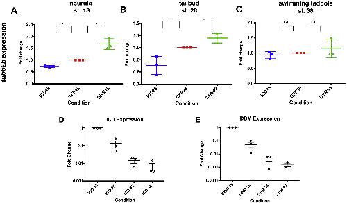 Fig. 2. Quantification of tubb2b expression and construct persistence. qRT-PCR confirms that ICD injected embryos express less tubb2b, while DBM injected embryos express more tubb2b at the neurula stage (A). tubb2b expression remains perturbed at the tailbud stage (B), but at the swimming tadpole stage, no difference in expression level is detected when comparing perturbed embryos to vehicle-injected controls (n â= â3) (C). qRT-PCR shows that while ICD (D) (n â= â3) and DBM (E) (n â= â3) mRNAs degrade over time, both are still detectable throughout the swimming tadpole stages. Bars represent mean â± âSEM. * â= âp â< â0.05, ** â= âp â< â0.01.