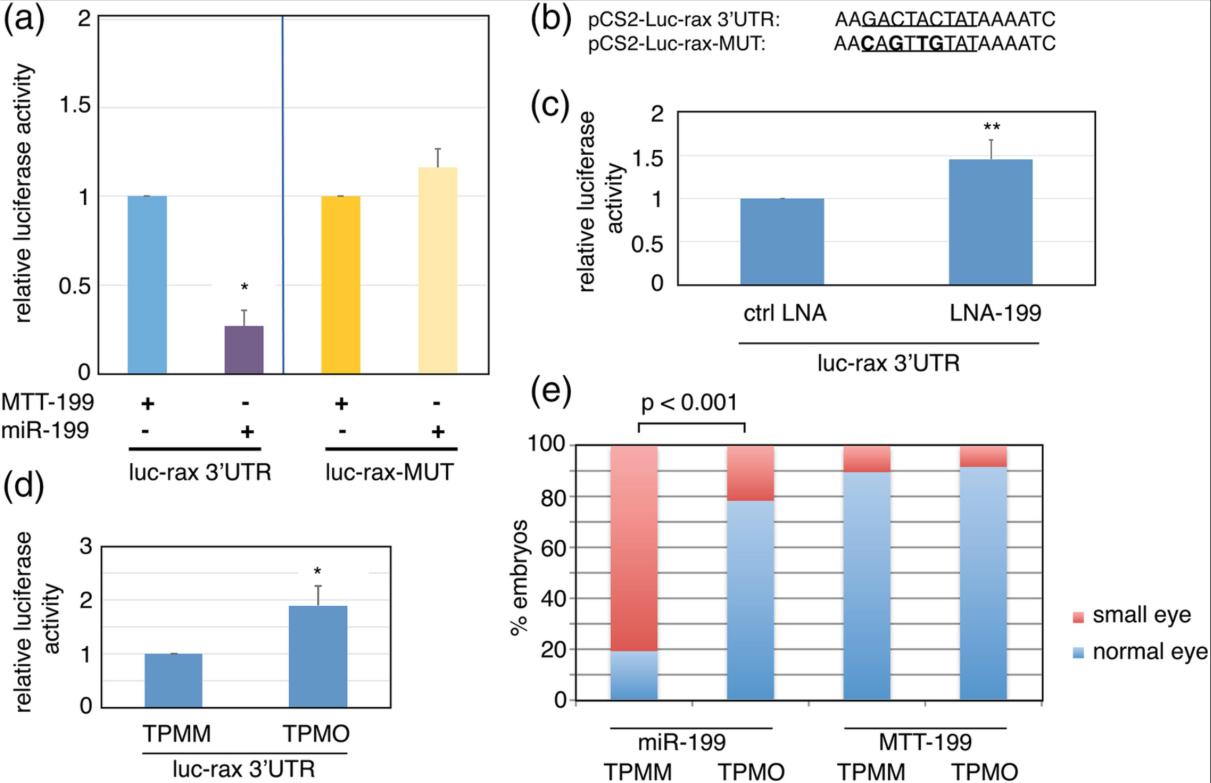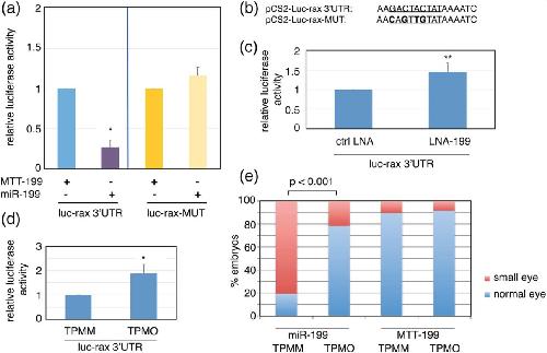 Figure 5. Validation of interactions between the rax1A 3â²UTR and miRâ199aâ3p. Luciferase âsensorâ constructs carrying the rax1a 3â²UTR were used to evaluate the sensitivity of the rax 3â²UTR to miRâ199 gainâ and lossâofâfunction. (a) Luciferase assay of embryos injected with either the wild type (lucâraxâ3â²UTR, left) or mutant (lucâraxâMUT, right) luciferase constructs (b), in combination with either the wild type miRâ199 sequence (miRâ199) or a mutant sequence carrying four reversed bases within the seedâbinding sequence (MTTâ199). For both the wild type and the mutant 3â²UTR construct, the results for the miRâ199 overexpression are normalized to those of the sample containing MTTâ199. (N = 5 independent experiments; *pâ<â.05; unpaired Student's t test for all panels shown). (b) Comparison of the putative miRâ199 sequences for the lucâraxâ3â²UTR and the lucâraxâMUT constructs. The âseed sequenceâ is underlined. Four bases within the seed sequence are reversed in the MUT construct, and these changes are complementary to the mutations in MTTâ199. (c) Luciferase assay of embryos injected with the lucâraxâ3â²UTR construct in combination with a LNA oligonucleotide inhibitor of miRâ199 (LNAâ199) or a control LNA sequence (ctrl LNA). (N = 5 independent experiments; **pâ<â.01). (D) Luciferase assay of embryos injected with the lucâraxâ3â²UTR construct and a TPMO complementary to the predicted miRâ199 binding sequence within the rax 3â²UTR. (N = 4 independent experiments; *pâ<â.05). (e) To evaluate the significance of interactions between miRâ199 and the rax 3â²UTR, targeted injections were carried out with the either wild type or mutant forms of miRâ199 in the presence of either the TPMO or a 5âbase mispair MO (TPMM). Embryos were scored for the small eye phenotype. (N = 363 embryos across nine independent experiments). LNA, locked nucleic acid; TPMO, âtarget protectorâ morpholino oligonucleotide |
