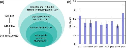 Figure 7. Identification and testing of miRâ199 candidate target genes. (a) Model of miRâ199 function as a positive regulator of eye development, and criteria for identifying relevant candidates among predicted miRâ199 targets. (B) QâRTâPCR to evaluate the effects of miRâ199 knockdown on expression of relevant candidate targets of miRâ199. LNAâ199 or the control LNA were introduced by targeted injection, injected embryos were cultured until st. 18, and collected for RNA isolation and QâRTâPCR. Values represent the meanâ±âS.E.M of the fold difference relative to controls. N = 4 independent experiments, *pâ<â.05; unpaired Student's t test. QâRTâPCR, quantitative reverseâtranscriptaseâpolymerase chain reaction; LNA, locked nucleic acid |