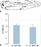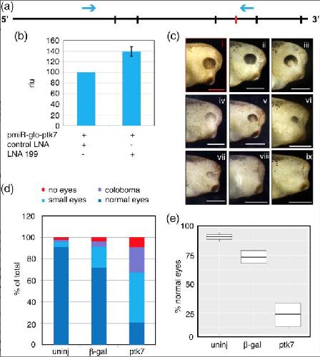 Figure 8. Overexpression of ptk7 inhibits eye development. (a) Representation of predicted miRâ199 binding sites on ptk7 3â²UTR. Red bar indicates strongest predicted target sequence. Blue arrows indicate the portion of 3â²UTR cloned into the pmiRglo (PMG) plasmid for luciferase assays. (b) Embryos were prepared by bilateral targeted injections (50âpg plasmid +1.5â2 μg LNA) and collected at stage 24 for luciferase assay. (N = 4 independent experiments, *pâ<â.05; unpaired Student's t test). Values represent meanâ±âS.E.M. (c) Representative images of St 35 tail bud embryos after ptk7 overexpression. Embryos were injected in both dorsal animal blastomeres at the 8âcell stage with 1.5â2 μg/embryo of mRNA encoding ptk7 or βâgalactosidase. Panel (i) shows results of βâgalactosidase control targeted overexpression at St 35 showing a typical eye. Panels (iiâix) show the range of phenotypes observed, from the normal phenotype in (ii) to the absence of eye formation observed in panels (viiiâix). Scale bar indicates 500âμm. (D) Quantitative representation of targeted ptk7 overexpression phenotypes from four independent experiments. Ptk7âoverexpressing embryos (n = 43) exhibit a normal eye phenotype in 22% of the population (panel ii) as compared to 91% in uninjected embryos (n = 142) and 72% in βâgalactosidase injected embryos (n = 57.) In the remainder of the embryos overexpressing ptk7, 46% exhibit a small eye (panels vâvii in c), 23% are characterized by a coloboma (panels iiiâv in c), and 9% show a loss of eye formation (panels viiiâix in c). (e) The percentage of normal eyes in each population is significantly different between ptk7âoverexpressing embryos and βâgalactosidaseâoverexpressing embryos. (**pââ¥â.001; unpaired Student's t test). Significance was calculated in R based on the percentage of normal eyes for each population for all biological replicates using ANOVA in conjunction with Tukey's HSD analysis set at a 95% confidence level) |