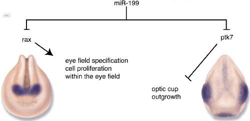 Figure 9. Roles for miRâ199 in eye development. The microRNA miRâ199 targets rax during neurula stages, contributing to the regulation of eye field specification and cell proliferation. It also targets ptk7, which negatively regulates morphogenesis of the optic cup. Purple shaded areas indicate regions affected by mirâ199 expression through either rax (left) or ptk7 (right) |