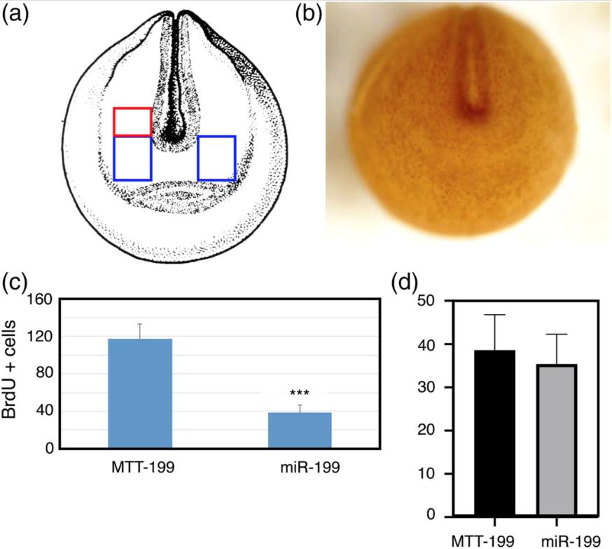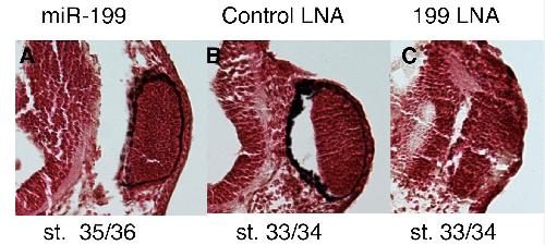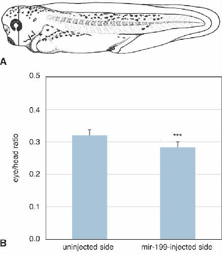 Figure 2. Expression of miRâ199aâ3p during early development. In situ hybridizations were carried out using an LNA probe to evaluate expression of mirâ199 within the eye field. (a) Vegetal view of miRâ199 expression in the circumblastoporal region at st. 11. (bâd) Dorsal, lateral, and frontal views showing expression of miRâ199 at st. 18. (e) Frontal view of miRâ199 expression at st. 23; arrows in (d) and (e) indicate expression in eyeâforming regions. (f, g â boxed) Frontal and dorsal views of st. 18 embryos that have been hybridized in situ with a control LNA probe. All scale bars approximately 250âμm. In situ hybridizations were carried out on embryos from three independent clutches. LNA, Locked nucleic acid |