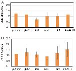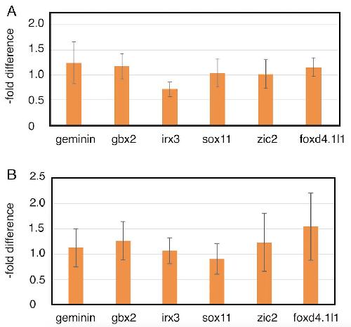Figure S2 Expression of nontargeted neural transcription factors following gainâ or lossâofâfunction of miRâ199. Quantitative reverseâtranscriptaseâpolymerase chain reaction of several neural transcription factors (geminin, gbx2.1, irx3, sox11, zic2, and foxd4l1.1) following overexpression (a) or knockdown (b) of miR199. These genes were selected because they (a) are transcription factors expressed in neural ectoderm (as opposed to the eye field); and (b) they do not possess highâconfidence target sites for miRâ199 in their 3â²UTRs. Embryos were subjected to targeted injection of either miRâ199 (a) or LNAâ199 (b) with corresponding controls (MTTâ199 or control LNA) as described previously, and lysed at st. 18. No significant changes in gene expression were observed in the expression of these genes following either overexpression (a) or knockdown (b) of miRâ199. (a) n = 6 independent experiments; (B) n = 4 independent experiments. Results are presented as fold difference relative to controls; pâ>â.05 for all genes tested. |