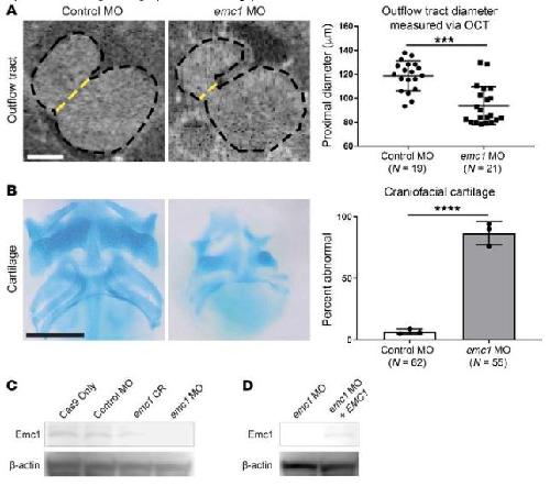 Figure 1. 1-cellâstage embryos were injected with either standard control MO or emc1 MO and phenotypically assessed at stage 45. (A) Representative images and measurements of 3 replicates of stage 45 control MO (n = 19) and emc1 MO (n = 21) embryo outflow tract morphology imaged with OCT imaging (dotted yellow line indicates measured diameter). Scale bar: 100 μm. (B) Representative images and percentages of 3 replicates of stage 45 control MO (n = 62) and emc1 MO (n = 55) embryo craniofacial cartilage stained with Alcian blue. Scale bar: 250 μm. (C) Immunoblot of pooled (n = 20) Emc1 protein in control and emc1 knockout/knockdown embryos. (D) Immunoblot of pooled (n = 20) Emc1 protein in emc1 knockdown and EMC1 rescued emc1 knockdown embryos. ****P < 0.0001, ***P < 0.0005 by (A) Studentâs t test or (B) Fisherâs exact test. Bars indicate mean and SD. |