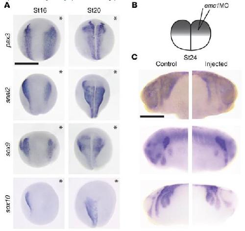 Figure 2. Embryos were injected into 1 cell at the 2-cell stage with emc1 MO followed by interrogation of neural crest markers via WISH. (A) WISH for markers of NCC cell lineage revealed that expression of earlier markers (pax3, snai2, and sox9) was present at expected developmental stages (stages 16 and 20 shown) but displayed abnormal distribution; the later marker sox10 was almost entirely lost (n = 45 per marker per stage done in 3 replicates; injected halves of embryos indicated by asterisks). Scale bar: 500 μm. (B) Schematic of the experimental setup, in which injection of MO into 1 cell of a 2-cell embryo allowed for 1 side of the embryo to develop under the effects of the MO injection; the other half served as an internal control for developmental phenotypes. (C) Markers showed abnormal distribution at later stages (stage 24 shown), suggesting mispatterning of the embryonic rostrum (n = 45 per marker per stage done in 3 replicates). Scale bar: 500 μm. |
