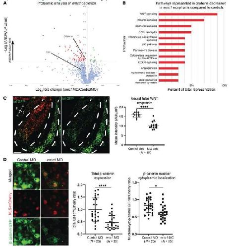 Figure 3. One-cellâstage embryos were injected with either standard control MO or emc1 MO, and LFQMS was carried out on stage 24 embryos. (A) Plot of mean protein levels from 3 biological replicates of 20 pooled emc1 morphants compared with control morphants as determined via LFQMS (statistically significantly increased proteins are shown in green, statistically significantly decreased proteins are shown in red, Fzd2 is shown as a black dot since it was only identified by one unique peptide sequence as opposed to the other proteins in the graph). (B) Plot of gene ontology terms for statistically significantly decreased proteins with human homologs displays enrichment for a subset of signaling pathways. (C) Representative image and quantitation of WNT signaling visualized in a transgenic Xenopus WNT reporter line as a comparison between mean fluorescence of emc1 MO-injected versus uninjected sides of the neural tube (white dotted line shows outline of neural tube and division between injected and uninjected sides). P, posterior; A, anterior; R, right; L, left. Scale bar: 100 μm. (D) Representative image and quantitation of β-catenin subcellular localization visualized in Xenopus neural tubes as a comparison between emc1 MO-injected versus control MO-injected embryos normalized to NLS-mCherry localization. Statistically significant protein changes assessed via ANOVA (A) with red and green points indicating P < 0.05. Scale bar: 10 μm. ****P < 0.0001, *P < 0.05 by Studentâs paired t test (C) and Studentâs t test (D). Bars indicate mean and SD. |
