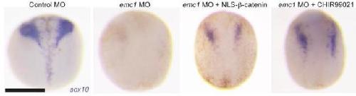 Figure 5. Expression of sox10 in control MO-injected embryos raised in media containing DMSO showed stereotyped expression of this marker at stage 20; loss of sox10 expression in stage 20 embryos was observed after injection with emc1 MO. sox10 expression was partially rescued by injection of NLS-fused β-catenin mRNA or the small molecular GSK3β inhibitor CHIR 99021. Three replicates of 15 embryos were analyzed for each condition. Scale bar: 500 μm. |
