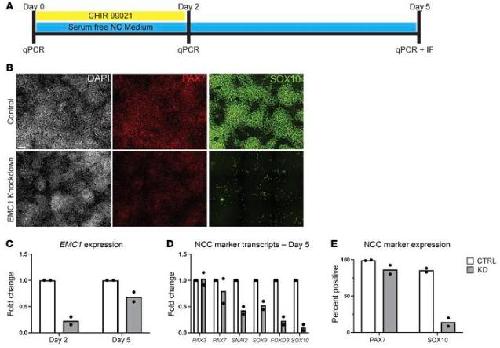 Figure 6. (A) Schematic of the induction protocol used to generate hNCCs in which hESCs were exposed to CHIR 99021 for 2 days in serum-free medium prior to withdrawal of this agent and continued culture for 3 additional days. (B) Immunofluorescent antibody staining for NCC markers PAX7 and SOX10 at day 5 in EMC1 siRNA-treated cells as compared with control siRNA-treated cells performed in 2 separate biological replicates. Scale bar: 100 μm. (C) qPCR analysis at day 2 and day 5 showed a decrease in transcripts of EMC1 performed in 2 separate biological replicates. (D) qPCR analysis at day 5 performed in 2 separate biological replicates showed decreased levels of several NCC marker transcripts (PAX7, SNAI2, SOX9, FOXD3, SOX10), although other markers appeared to be unaffected (PAX3). (E) Quantified percentage of cells expressing each PAX7 and SOX10 protein performed in 2 separate biological replicates. |