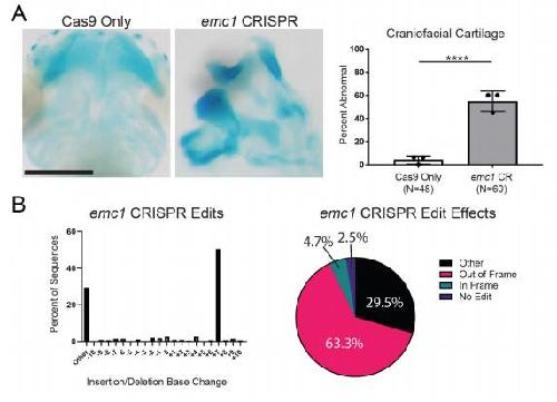 Supplemental Figure 2 F0 CRISPR mosaic knockout of emc1 causes abnormal craniofacial morphology. (A) Representative images and quantitation of Cas9 only (n=48) and Cas9 + emc1 sgRNA injected (n=60) stage 45 embryos stained with Alcian blue over 3 biological replicates. Scale bar indicates 250 μm. (B) Example TIDE analysis of insertion and deletion sizes along with their predicted effects in one embryo. This analysis of single embryos was carried out in 5 replicates to ensure consistent CRISPR mediated targeting. âOtherâ indicates changes that could not be analyzed via TIDE due to large size of indel. ****pâ<â0.0001 by Fisherâs exact test. Bars indicate mean and SD. |