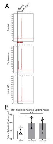 Supplemental Figure 3 Fragment analysis of xbp1 splicing demonstrates increased endoplasmic reticulum stress in emc1 morphants. (A) Examples of traces obtained from fragment analysis for xbp1 spliced and un-spliced forms in 4-5 replicates of 30 pooled stage 24 control embryos, tunicamycin (positive control) treated embryos, and emc1 morphant embryos. (B) Ratios of area under the curve measurements corresponding to peaks of spliced to unspliced forms of xbp1 in stage 24 control embryos, tunicamycin (positive control) treated embryos, and emc1 morphant embryos demonstrate an increase in xbp1 splicing in emc1 morphants. *p<0.05 by Studentâs T-test. Bars indicate mean and SD. |