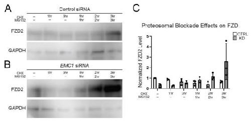 Supplemental Figure 5 Immunoblot analysis of FZD2 levels reveals proteasomal degradation as the source of FZD2 clearance in EMC1 depleted RPE cells. (A) Immunoblot of FZD2 in cells transfected with a control siRNA and subjected to either cycloheximide treatment alone or cycloheximide and MG132 proteasomal inhibition performed in 3 biological replicates. (B) Immunoblot of FZD2 in cells transfected with EMC1 siRNA and subjected to either cycloheximide treatment alone or cycloheximide and MG132 proteasomal inhibition performed in 3 biological replicates. (C) Normalized densitometry of FZD2 levels from immunoblot assays. Bars indicate mean and SD. |