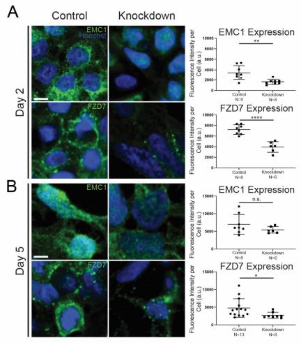 Supplemental Figure 7 EMC1 knockdown via siRNA results in decreased FZD7 in hESC derived neural crest cells. (A) Immunofluorescence antibody labeling of EMC1 and FZD7 at day 2 of neural crest induction reveals a decrease in both as well as a more punctate appearance in residual FZD7 signal as compared to control siRNA treated cells. Cells in 3 replicates of 2-3 high power fields were assessed for each marker per condition. Scale bar indicates 5 μm. (B) Immunofluorescence antibody labeling of EMC1 and FZD7 at day 5 of neural crest induction reveals a recovery in EMC1 while FZD7 remains diminished and in a punctate pattern. Cells in 3 replicates of 2-4 high power fields were assessed for each marker per condition. Scale bar indicates 5 μm. Bars indicate mean and SD |